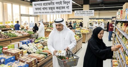 কর্তৃপক্ষ স্পষ্ট করেছে যে, প্রয়োজনে অতিরিক্ত পণ্য মজুত করা বা ‘প্যানিক বায়িং’ করার কোনো যৌক্তিক কারণ নেই। এই ধরনের প্রবণতা বাজারে কৃত্রিম সংকট তৈরি করতে পারে এবং সাধারণ সরবরাহ চেইনকে ব্যাহত করতে পারে। মন্ত্রণালয়ের পক্ষ থেকে নিয়মিত বাজার তদারকি করা হচ্ছে যাতে করে পণ্যের দাম স্থিতিশীল থাকে এবং কেউ যেন পরিস্থিতির সুযোগ নিয়ে অবৈধভাবে দাম বাড়াতে না পারে। সাধারণ মানুষকে শুধুমাত্র তাদের দৈনন্দিন প্রয়োজনীয় পণ্য কেনার পরামর্শ দিয়ে আশ্বস্ত করা হয়েছে যে, কুয়েতের গুদামগুলোতে দীর্ঘ সময়ের জন্য পর্যাপ্ত খাদ্য ও মৌলিক পণ্য মজুত রয়েছে। তাই অযথা আতঙ্কিত না হয়ে স্বাভাবিক কেনাকাটা বজায় রাখাই বর্তমান পরিস্থিতিতে কাম্য।