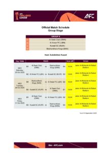 ২৫ অক্টোবর প্রথম ম্যাচ: বসুন্ধরা কিংস বনাম আল-সিব (ওমান)। ২৮ অক্টোবর দ্বিতীয় ম্যাচ: বসুন্ধরা কিংস বনাম আল-আনসার (লেবানন)।