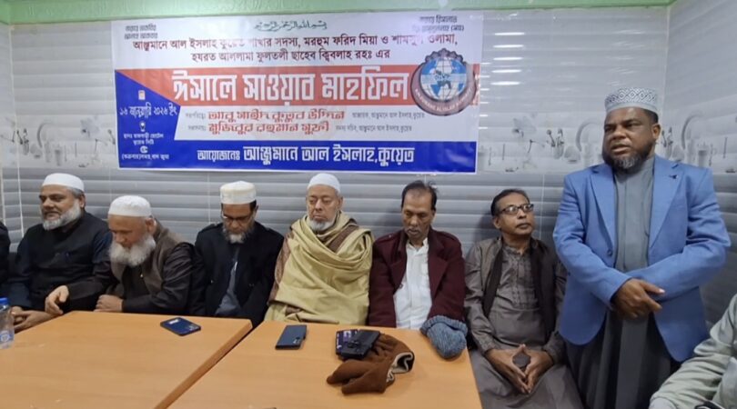 বিশেষ প্রতিনিধিঃ কুয়েতে আনজুমানে আল-ইসলাহ কুয়েত শাখার উদ্যোগে সংগঠনের সদস্য মরহুম ফরিদ মিয়া এবং শামসুল উলামা হযরত আল্লামা ফুলতলী ছাহেব ক্বিবলাহ (রহ.)-এর স্মরণে ঈসালে সাওয়াব মাহফিল অনুষ্ঠিত হয়েছে। কুয়েত সিটির রাজবাড়ী হোটেলে আয়োজিত এই অনুষ্ঠানে সভাপতিত্ব করেন সংগঠনের আহ্বায়ক আবু সাইদ কুতুবউদ্দিন। সদস্য সচিব মুজিবুর রহমান সুফি এবং সাবেক সাধারণ সম্পাদক মাওলানা কাওসার আহমদ সেলিমের যৌথ সঞ্চালনায় অনুষ্ঠানে প্রধান অতিথি হিসেবে উপস্থিত ছিলেন সংগঠনের সাবেক সভাপতি ক্বারী সালেহ আহমদ।