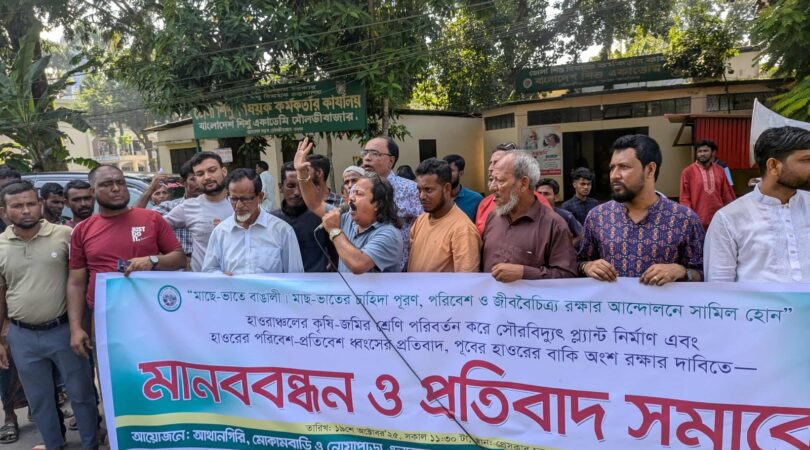 হাওরাঞ্চলের কৃষিজমির শ্রেণি পরিবর্তন করে সৌরবিদ্যুৎ প্ল্যান্ট নির্মাণ এবং হাওরের পরিবেশ-প্রতিবেশ ধ্বংসের প্রতিবাদ, পূবের হাওরের বাকি অংশ রক্ষার দাবি জানান কৃষক, মৎস্যজীবি, হাওর ও পরিবেশ রক্ষা আন্দোলনের সদস্যরা।
