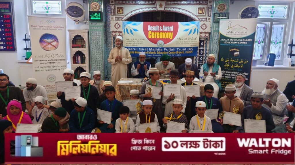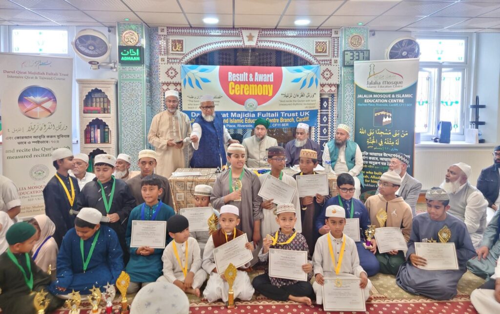 এক আনন্দঘন ও উৎসবমুখর পরিবেশে যুক্তরাজ্যের ওয়েলসের রাজধানী কার্ডিফ শহরের জালালিয়া মসজিদ এন্ড ইসলামিক সেন্টারে গত ২৪শে আগস্ট অনুষ্ঠিত হলো দারুল ক্বিরাত মজিদিয়া ফুলতলী ট্রাস্ট ইউকের অনুমোদিত কার্ডিফ শাখা কেন্দ্রের ‘ ক্বিরাত ও তাজবীদ কোর্স ২০২৫’-এর সমাপনী ও বর্ণাঢ্য পুরস্কার বিতরণী অনুষ্ঠান। শতাধিক শিক্ষার্থী, শিক্ষক, অভিভাবক এবং স্থানীয় কমিউনিটির বিশিষ্ট ব্যক্তিবর্গের উপস্থিতিতে অনুষ্ঠানটি সফলভাবে সম্পন্ন হয়।